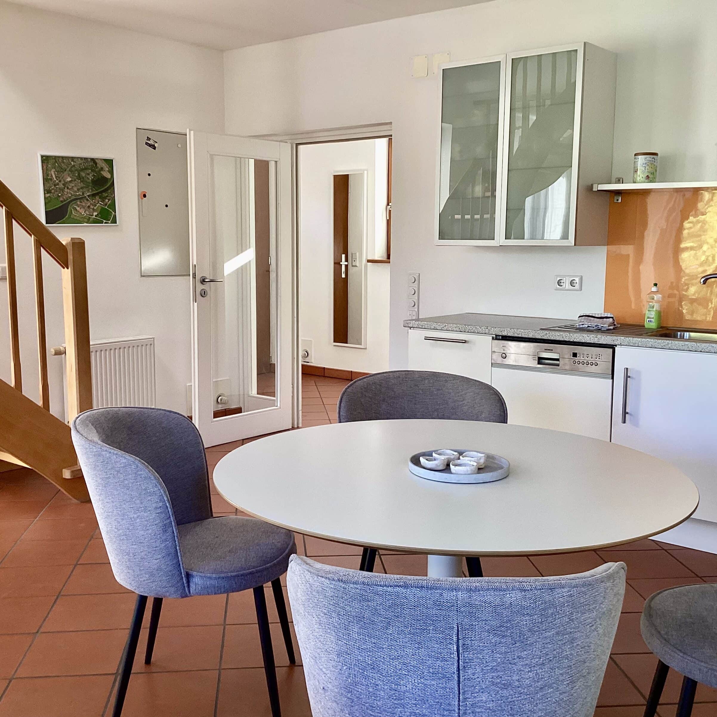 Im Erdgeschoss erwartet dich ein großzügiger, ca. 40 m² großer Wohnraum mit offener, voll ausgestatteter Küche, Essplatz und gemütlicher Sofaecke. Die Küche bietet alles für gemeinsames Kochen: Cerankochfeld, Backofen, Mikrowelle, Kühlschrank mit Gefrierfach und Geschirrspüler.